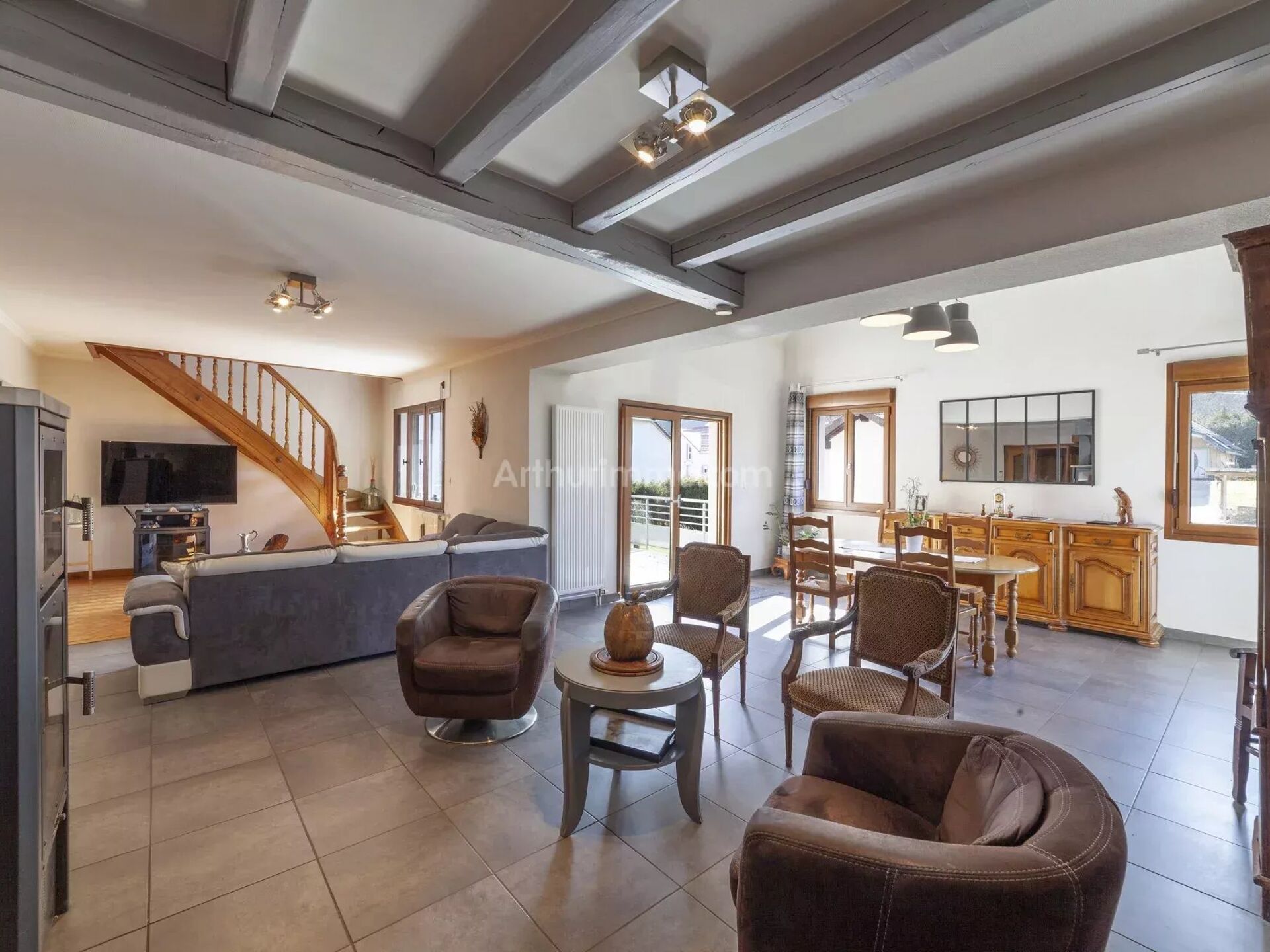Votre agence Arthurimmo est heureuse de vous présenter à Villers le Lac cette grande maison. Sur un terrain PLAT de 1000 m² elle vous offre 175 m² habitables + UN SOUS SOL COMPLET. Sa grande pièce de vie de plus de 70 m² avec cuisine ouverte, salle à manger et coin salon, ses 4 chambres dont deux très grandes, sa mezzanine, ses deux salles de bains, ses deux toilettes, son atelier, son coin buanderie, sa cave en font une habitation complète et confortable. Le chauffage central au gaz de ville couplé à un poêle à bois est efficace pour affronter les périodes de grand froid. En annexes: DEUX GARAGES avec portes motorisées où il est possible de garer trois voitures. Pour couronner le tout vous profiterez d'une belle terrasse d'environ 40 m² accessible depuis la pièce de vie exposée plein sud. A VOIR RAPIDEMENT.